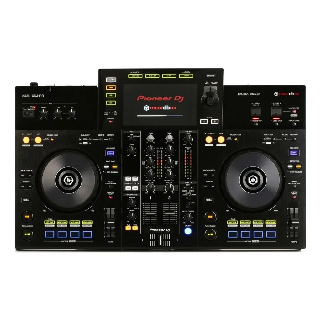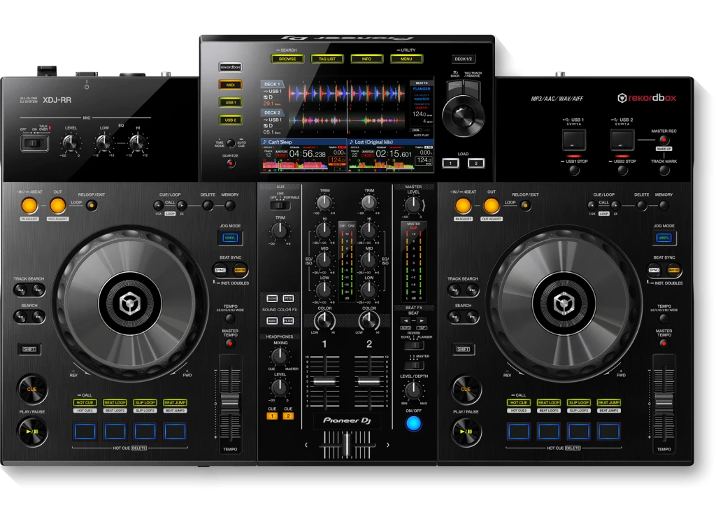 El Pioneer DJ XDJ-RR es un sistema DJ "todo en uno" de 2 canales, compacto y ligero, diseñado para ser portátil y funcionar sin ordenador (stand-alone) con rekordbox. Hereda el diseño y funciones del estándar de club NXS2, incluyendo una pantalla a color de 7 pulgadas, 2 puertos USB, efectos (Beat FX/Sound Color FX) y pads de rendimiento.