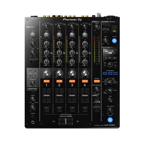 La Pioneer DJM-750MK2 es una mesa de mezclas de 4 canales diseñada para uso profesional, heredando características clave de la DJM-900NXS2. Ofrece Sound Color FX, Beat FX con control de frecuencia, y un Crossfader Magvel de alta precisión. Incluye tarjeta de sonido interna (48 kHz/64-bit) y es compatible con rekordbox dj y DVS