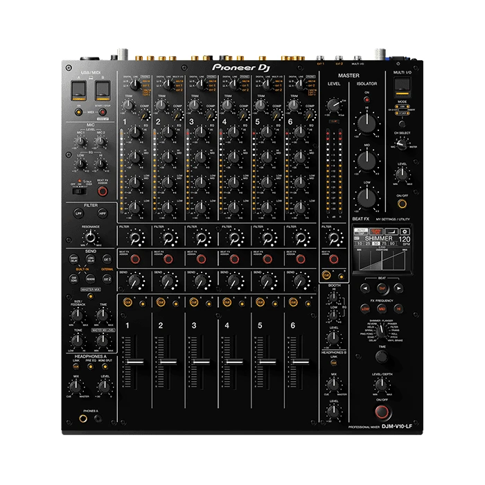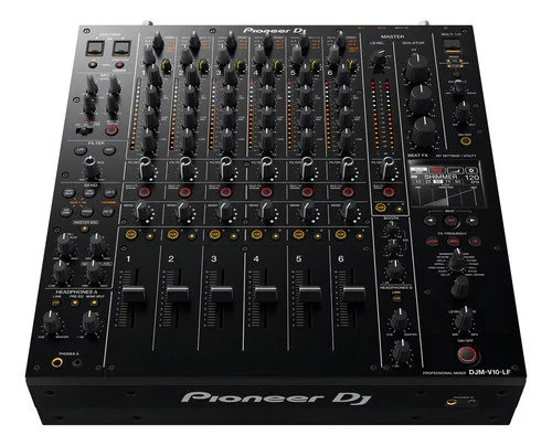 La Pioneer DJM-V10-LF es una mesa de mezclas profesional de 6 canales diseñada para la excelencia sonora y el control preciso, destacando por sus faders de canal de 60 mm de alta precisión, la ausencia de crossfader y curvas optimizadas. Ofrece un sonido cálido y profundo de 64 bits/96 kHz, ecualización de 4 bandas, compresores incorporados por canal y una amplia conectividad para equipos externos.